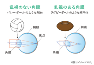 • 正常な角膜は球面状ですが、乱視のある角膜はラグビーボールのように一方向に歪んでいます。そのため、物の輪郭がにじんで見える、焦点が合いづらいといった視覚的な不快感があります。